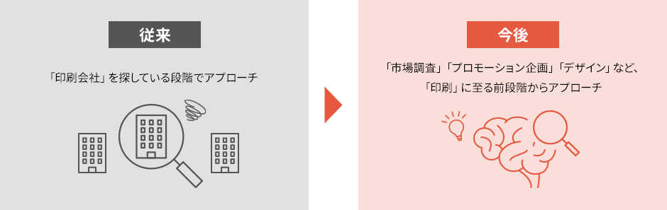 上記の様な業界特性から、見込客が「印刷会社」を検討する段階で接点を持っても、既存の取引先の相見積先にしかならず、商談や売上には結びつきづらいのではないかと仮説立てました。