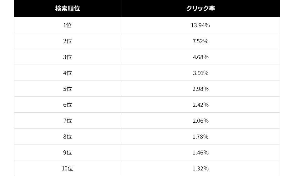 以下は、seoClarityが公開した2021年度の検索順位別のクリック率ですが、例えば、月間検索回数1,000回の対策キーワードが10位になったとしても10クリック、1位になったとしても約140クリックしか稼げない、という状態となり、これでは成果を出すために最低限必要な母数形成が出来ません。