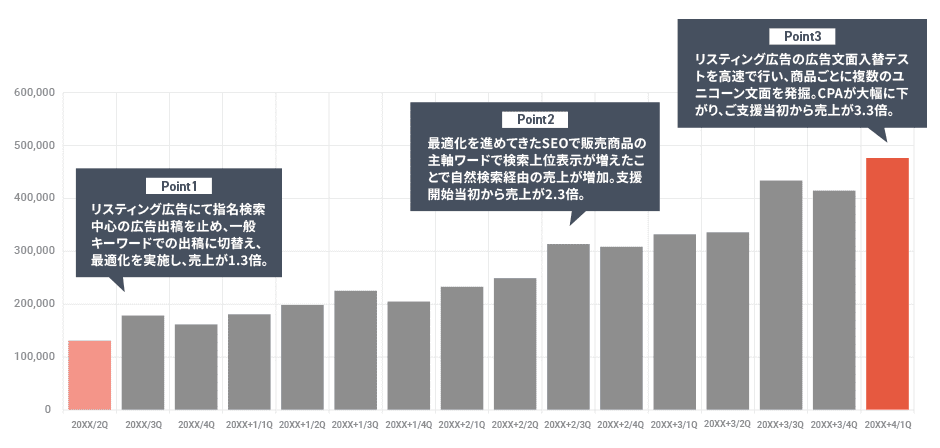 当初、C社様では広告運用のみ行っていましたが、広告改善はもちろんのこと、集客後のWebサイト改善や、顕在キーワードのSEO対策を徹底的に行い、ご支援開始当時から3年半で約3.6倍の売上に伸長しました。